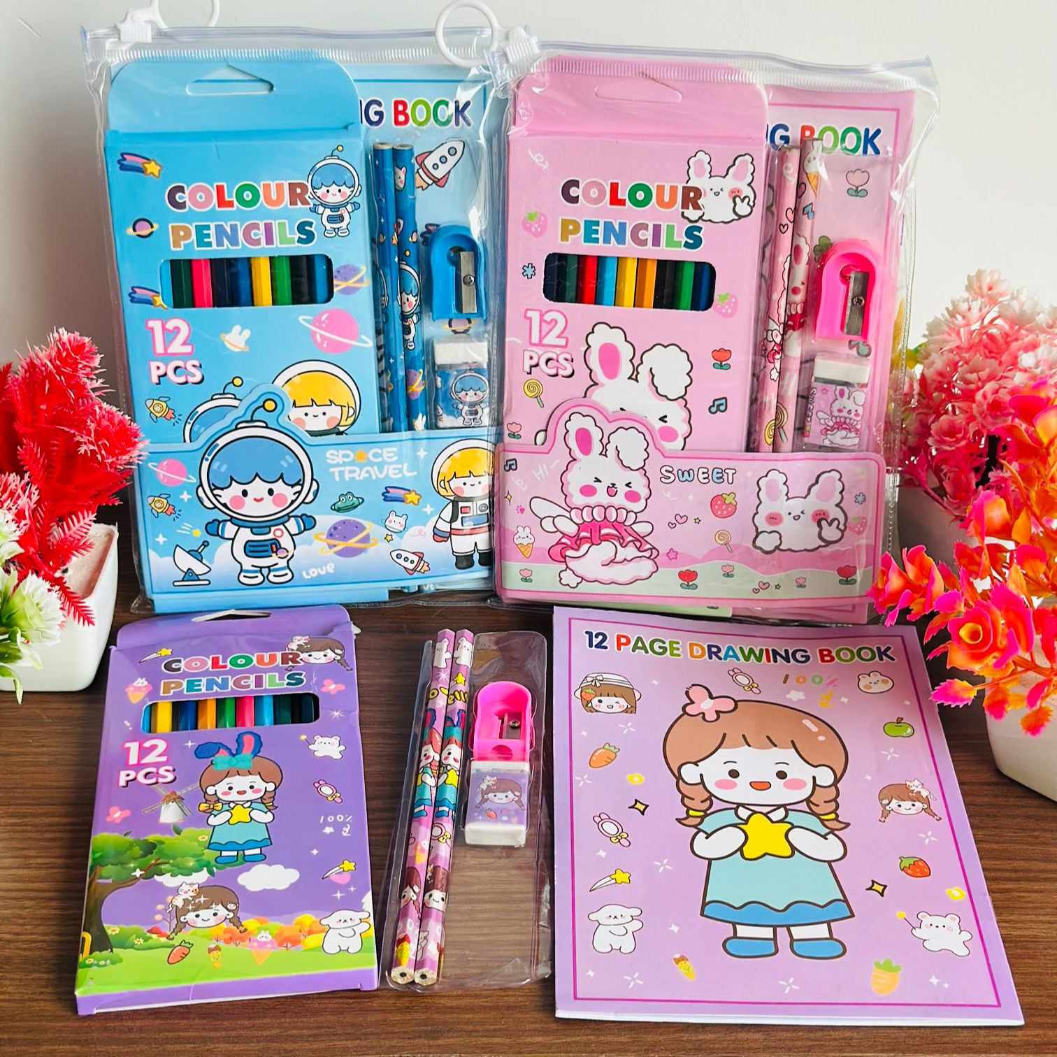 Premium quality gifting sets Includes – 12 color pencils – 2 hb pencils – Eraser – Sharpener – Drawing book *Price – 150 each*+&lk Moq 6 6 pc can go in 1 kg ship
